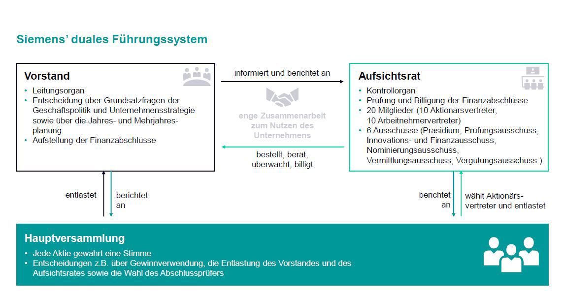Gemäß dem deutschen Aktienrecht, dem Siemens als deutsche Aktiengesellschaft mit Firmensitz in Berlin und München unterliegt, verfügt das Unternehmen über ein duales Führungssystem, bestehend aus einem Vorstand und einem Aufsichtsrat ("Two-Tier Board Structure").